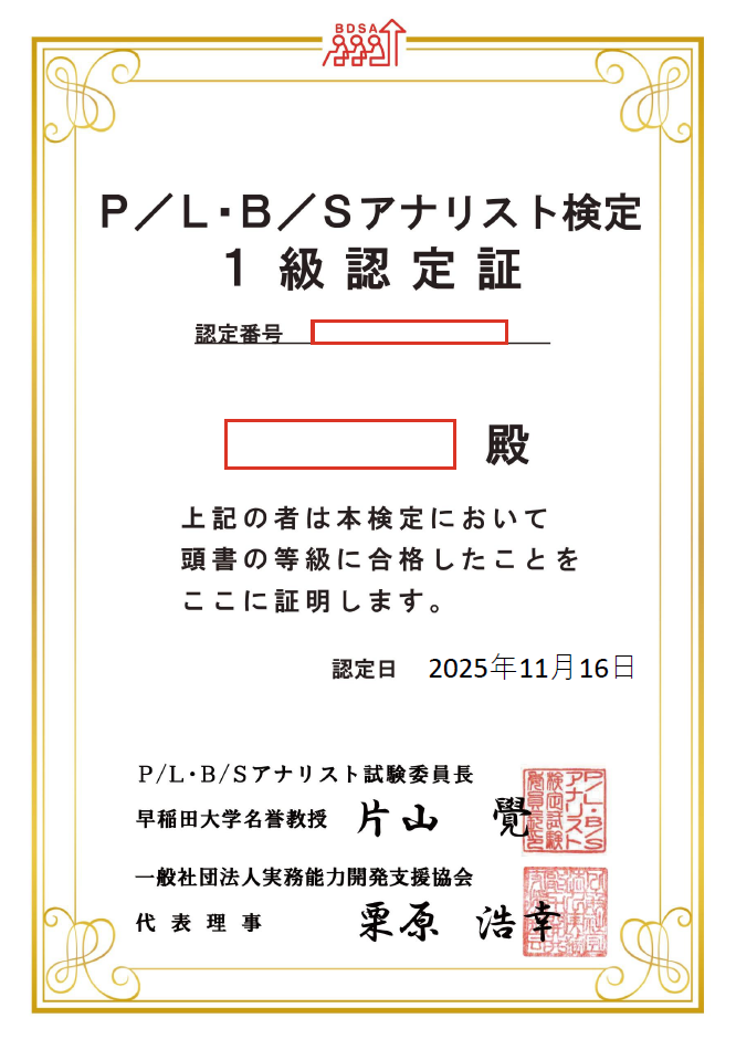 本日「P/L・B/Sアナリスト1級」に合格致しました♪