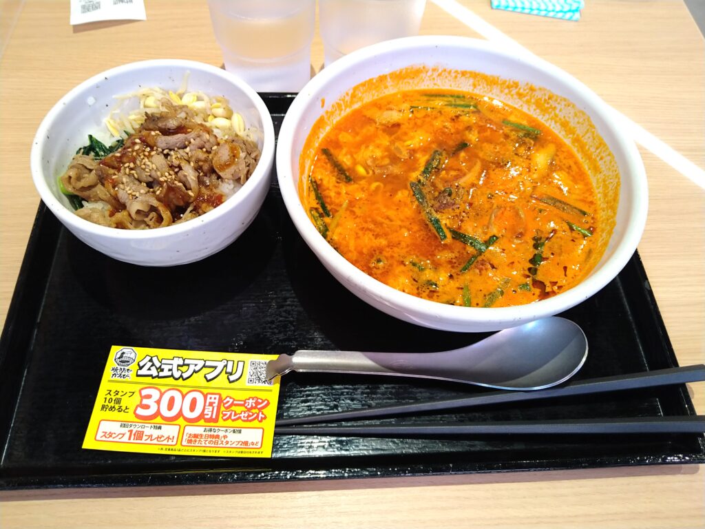 「ユッケジャンスープ」ってのがあって、自分は飲んだ事ないのでカルビ丼のミニがついたセットで頼んでみました!